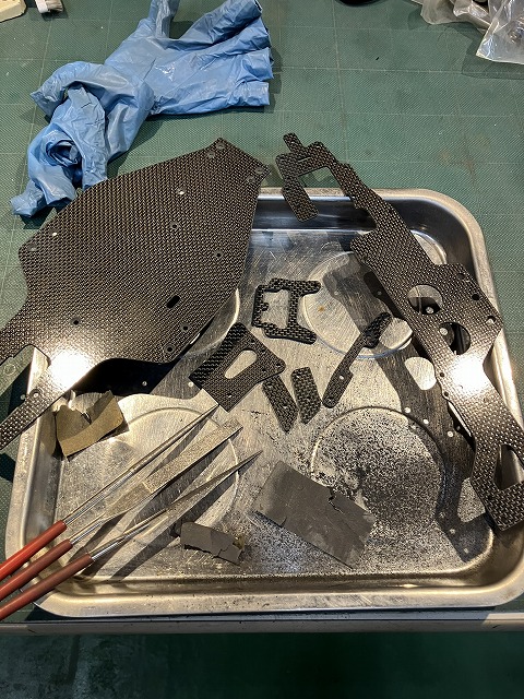○カーボン削り イグレスだし、せっかくだから「チタンビス」で組もうと思うので、しばらくは部品お取り寄せ待ちになるので、その間に出来るところを進めておく。 カーボン板系の部品の角落とし。 ダイヤモンドやすりと紙やすりでひたすら削るのみ。作業時間は2hくらい。 以前より賢くなって防塵マスクとニトリル手袋を使うようになった。 ただし、以前より近くが見えにくい。 |