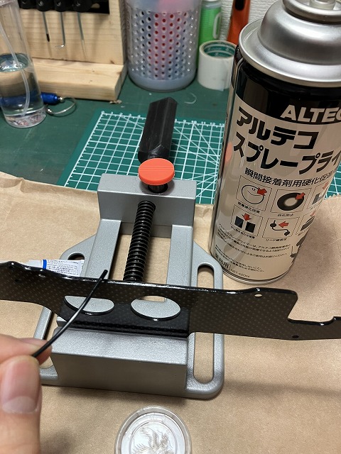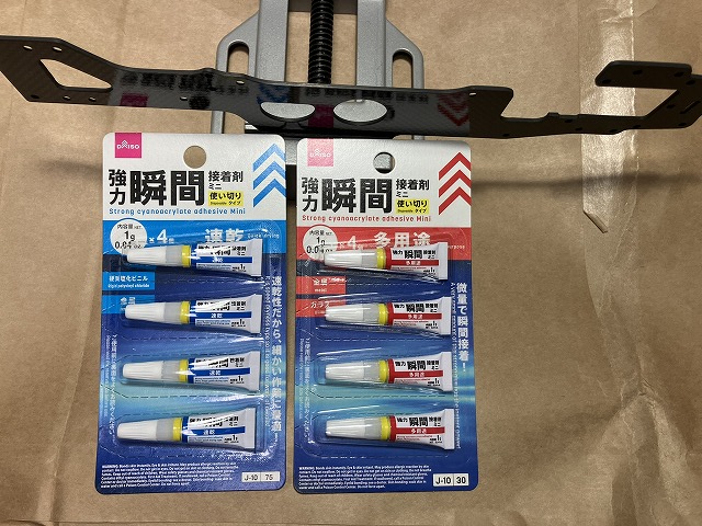 ○カーボン瞬着盛り 削ったカーボン版の側面に瞬間接着剤を流し込み割れにくくする作業。 ダイソーで売ってる瞬間接着剤は「速乾」「多用途」「ゼリー状」3種類あって、ラジコン用途としてどれがよいのか、わからんので「速乾」と「多用途」を買ってきた。 使ってみたところ、「速乾」が粘度が低くタイヤの接着に使える感じ。「多用途」はちょっとドロッとしており、タイヤ組むのにはやめた方が良さそう。 まぁ、速乾だけあればとりあえず問題はない。 |