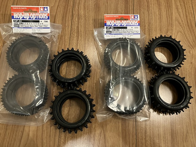 ○タイヤの互換性 ちょうど手元に「OP84 6029後輪スクエアスパイク」と「OP88 6024・4駆前輪スクエアスパイク」があるので装着可能か確認。 そういえば一時期(2000〜2008くらい?)は「スクエアスパイク」が生産してなくて「スパイヤースパイク」だけだったけど、現在は逆に「スパイヤースパイク」を全く見かけなくなった。(DF02系が最後?) |