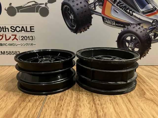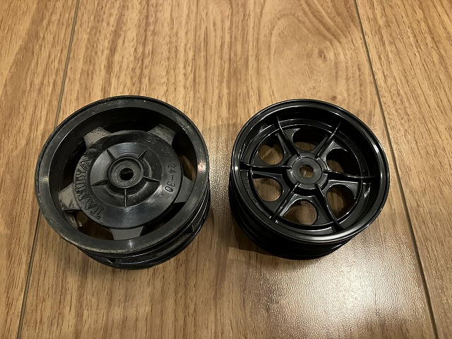 ○タイヤとホイールの互換性チェック 長年の謎だった、ホイールサイズをチェックしてみた。 定番スターデッシュと比較。 見た目にイグレスホイールの方が外径も幅もちょっと小さい。 数値的には外径-4mm、幅-2mm程度。オフセットはフロントはほぼ同じリヤのみ-1mmくらい。 いまさら気づいたが、このホイールのデザインってミニ四駆TYPE2シャーシに採用されてるのと同じだった。 |