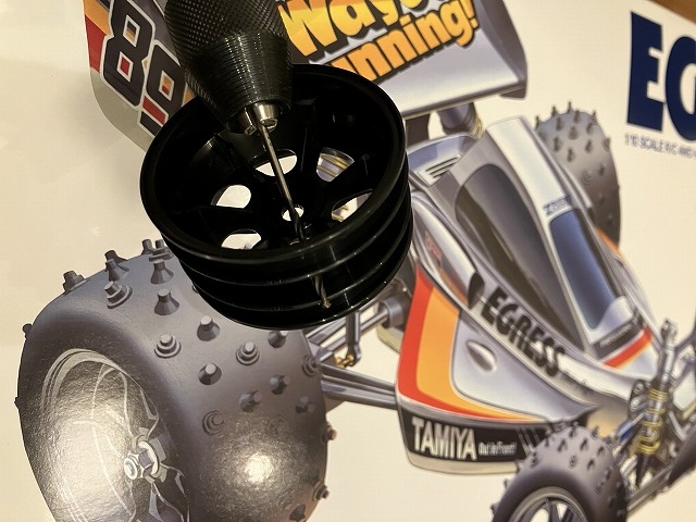 ホイールには空気穴は開いてないので自分で開けるスタイル。 なお、インナースポンジは付属していないので入れたければ別途購入で。 アバンテは付属していたんだけどな... タミヤ純正バギー用のインナーはAO扱い部品なので入手が面倒。 |