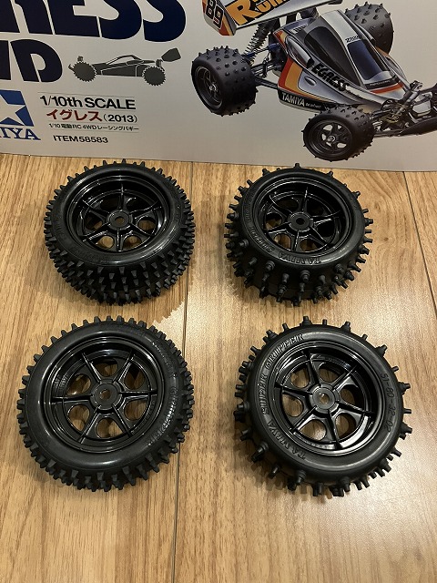 試し履きしてみた。 ハイブリッドピンスパイクはかなりゴムが固いので履かせるのが大変な指が痛くなる系のタイヤでした。もちろん接着は不要と思われる。 スクエアスパイクの方がゴムがやわらか。 EGホイールにスクエアスパイクは行けそうな感じであるがちょっと緩いので接着した方が良さそう。 まぁ、イグレスのかっこよさの一つは、このタイヤとホイールだと思っているので、基本的に変更する予定はないんだけど。 |