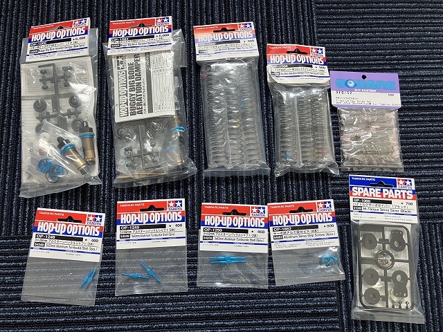 ○オプション部品が届いた! 上段左から、 タミヤOP-1505 バギー用ビックボアARダンパー(リヤ2本) タミヤOP-1504 バギー用ビックボアARダンパー(フロント2本) タミヤOP-1508 ビッグボアARダンパー用リヤスプリングセット タミヤOP-1506 ビッグボアARダンパー用フロントスプリングセット(4WD) スクエアSEG-52 チタンヘックスビスセット タミヤOP-1248 3x23アルミターンバックルシャフトセット(2本) タミヤOP-1249 3x32アルミターンバックルシャフトセット(2本) タミヤOP-1250 3x42アルミターンバックルシャフトセット(2本) タミヤOP-1862 サーボ用アルミ段付きビス(4本) タミヤSP-1000 ハイトルクサーボセイバー(ブラック) |