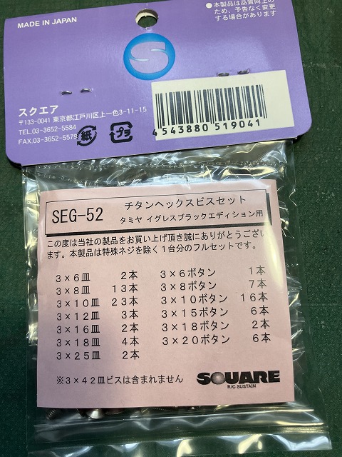 ○チタンビス 全部で87本入ってる。 2.6mmのタッピングビス(フロントサスアームマウント用)と3×42mm皿ビスは入っていない。 せめてヘックスにしようと思い探したが、3×42mmのヘックスは国内には存在しない模様。40mmより長いのを見つけられなかった。 何本か使われている超低頭のビスは入ってないよ。 |