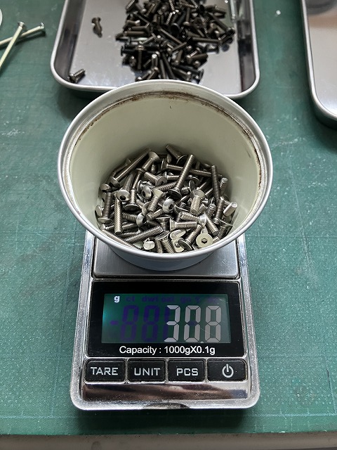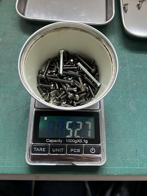 ○ビスの重さ比較 52.7g → 30.8g 約40%軽い!(ただし「はかり」の正確性は怪しい) |