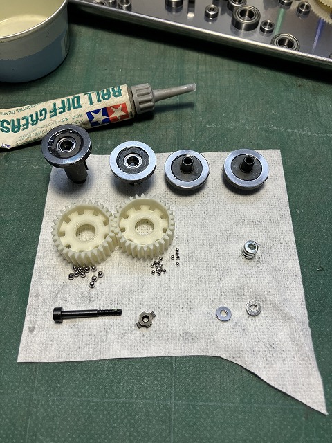○ボールデフの組み立て 新設計されたボールデフはインチ玉(3/32と1/16)でした。 ヤーポン法には困ったもんだが、RC業界はこっちが主流なのでタミヤもヤーポンになってしまったようだ。 (小さい玉にイライラしながら組んでたらデフキャリアの向きを間違えてる) なお、アバンテのセンターデフは昔ながらの3mm玉を使う皿バネ式。 |