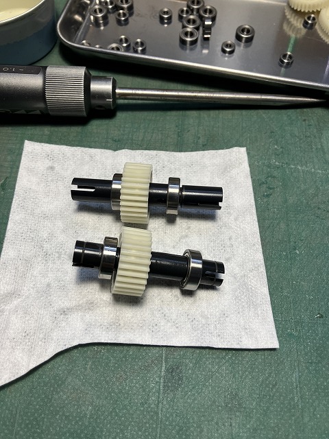○リヤのギヤボックス上から カウンターギヤの軸はフロントよりは太い5mm スパーギヤはベベルギヤと一体型。 トルクスプリッター仕様(センターワンウェイ)か直結仕様か選べる。 アバンテのセンターボールデフも使用可能。 センターボールデフを部品で組もうとすると、カスタマーお取り寄せで4,000円程度はかかる模様。 あとなぜか皿バネはVQSの説明書にしか部品番号が載ってないので注意(この皿バネはマンタレイ系のボールデフの部品と共通かも?) |