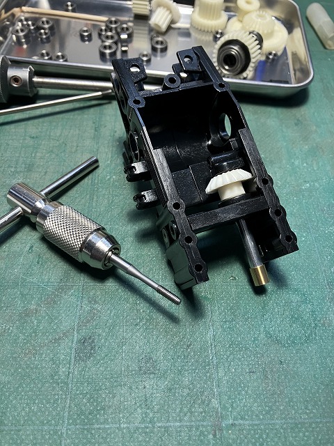 ○フロントのギヤボックス この辺はアバンテと共通。4分割構造。グラス混入素材 材質が硬く「ねじ」で「ねじを切る」のが大変なので、タミヤから出てる「OP-1232 3mmビス穴タップ(M3×0.5)」を使用。 樹脂を削らず「転造」するタイプのタップなので穴を痛めにくい。 カウンターギヤの軸が2mmと細いのが、あいかわらず気にはなるが。 後年のマンタレイ系は1ピース構造。複雑な設計&金型が出来るようになったってことと思われる。CADとか導入した時期なのかも。 |