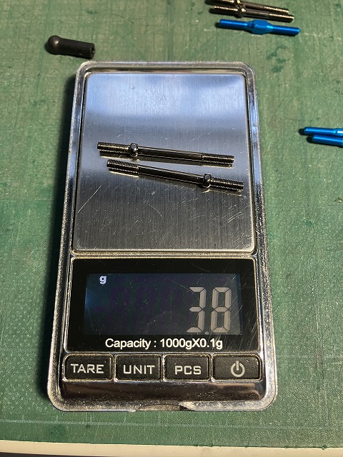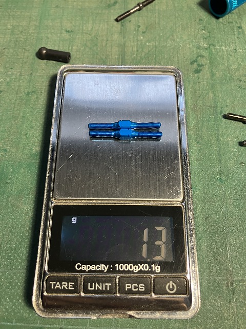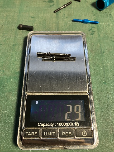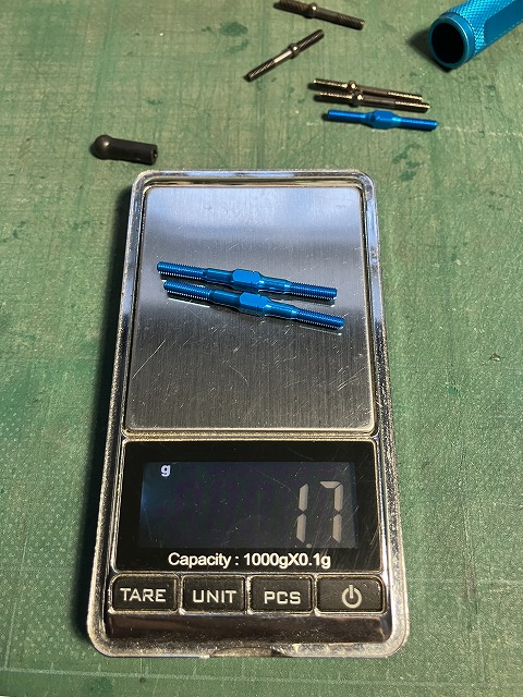 ターンバックル重さチェックその2 3x32mm 2.9g → 1.3g こっちも同じくらい。 ステアリング用は長さがそれぞれ異なるため比較はしていない (忘れてたとも言う) |