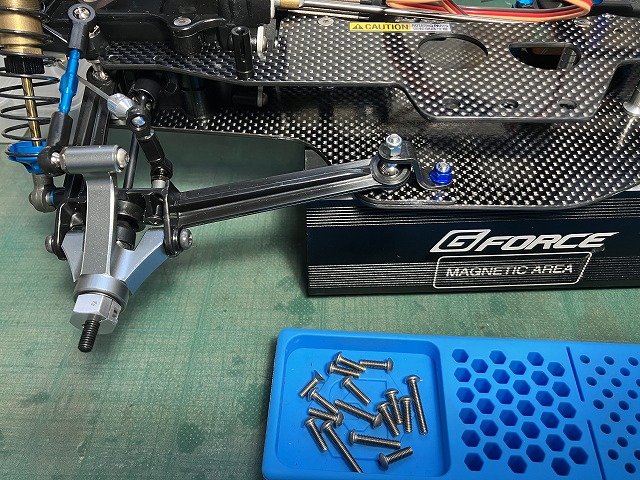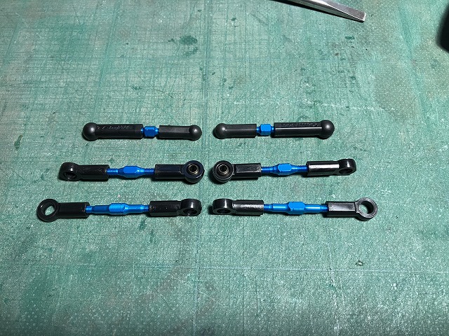 ○ターンバックル ちょっと財布が軽いのと、タミヤ製チタンだと入手しにくいサイズがあったのでアルミ製をチョイス。 3x28mmはサイズ展開がないので3x23mmに強化アジャスターをつけて対応。 |