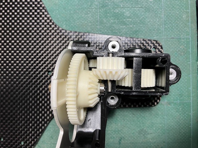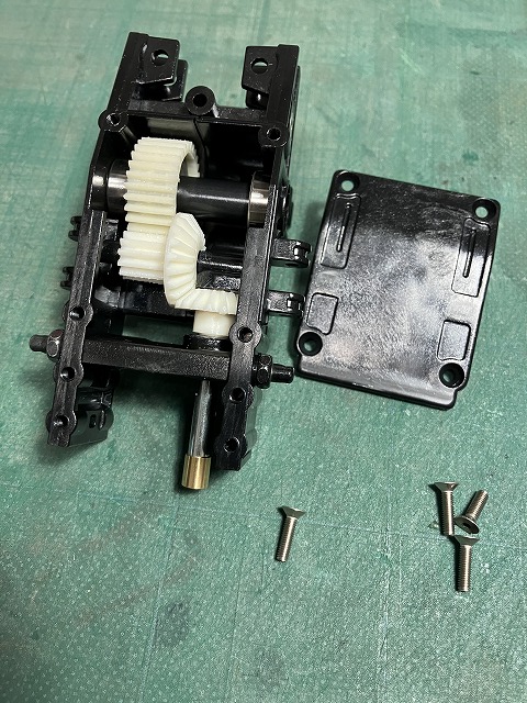 ○リヤのギヤボックス下から デフキャリアを逆に組むと、ギヤボックスには入るが壁面と接触して動きが微妙に重くなる。 微妙ってのが厄介で気づかず組んでも動いてしまう。要注意ポイント |
