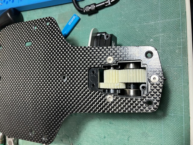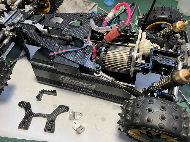 ○アバンテ整備性悪し アバンテからセンターボールデフをもぎ取ったので、直結ギヤを組み込んで修復。。 初めて分かったのだが、アバンテのスパーギヤの取り付け/外しはかなり面倒!なんせいろいろ引っかかってプロペラシャフトが入らない! 結局。リヤダンパーステーとシャーシ中央にあるバッテリーのガイドを外して、強引にギヤとプロペラシャフトを押し込む感じ。 別の方法だと、アッパーデッキ外す感じになるので、げんなりする。 なお、この部分はイグレスは簡単に作業できる。 |
