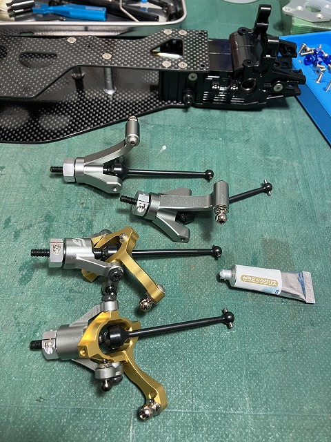 ○ナックルやらそのへん なかなかかっこいいぞ。 ガタはそれなりにあるので、シムで調整。 アップライトの軸に0.3mm、ユニバーサルシャフトと六角ハブの間に0.5〜0.6mmくらいシムを突っ込んで調整。 (4mmと5mmのシムがいるぞう) GFORCEのアルミ部品は寸法に若干バラツキあるような感じがする。 ベアリングは抜けてくるのでゴム系接着剤で固定しておいた。 ねじ部分にはロックタイト243(中強度)を薄ら塗っておいた。 イグレスにはねじロック剤は付属していないがVQSには付属しているという謎。 |