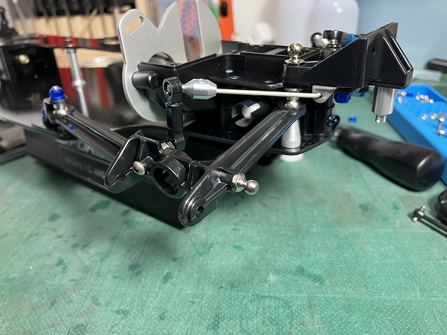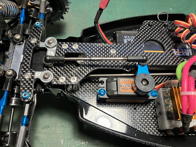 ○ステアリング周り(成功) サーボ位置、また変更するの面倒なので、色を妥協して手持ちのターンバックルシャフトで対応。 製造元不明チタンターンバックルシャフト。長さ70mm (20年以上前からデットストック。たぶんスポーツホビーで購入したヤツ) |