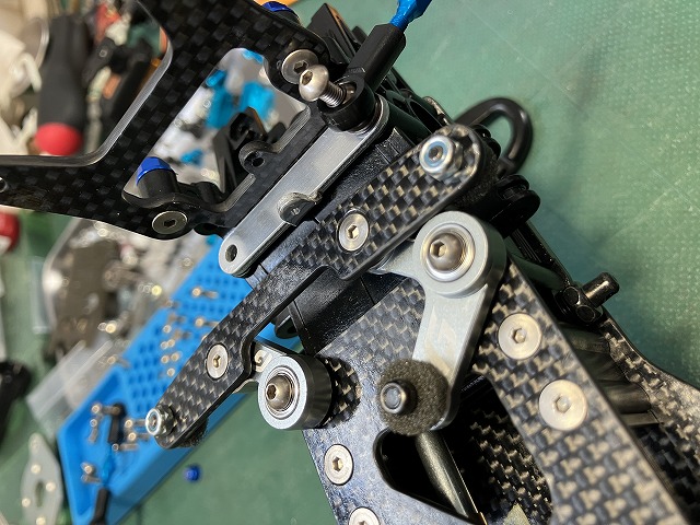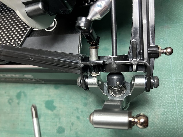 ○チタンビスとアルミアップライトの干渉 スタビの取り付け部分とリヤアップライトに干渉が発覚。 本来は超低頭ビスを使うところなんだけど、ボタンヘッドだったので干渉した模様。アルミのアップライトのせいかも知れんけど未確認。 左側はがっつり当たるが、右側はそうでもなかった。 超低頭ビスに戻しました。 あと、ここもシム調整。0.3mm入れました |