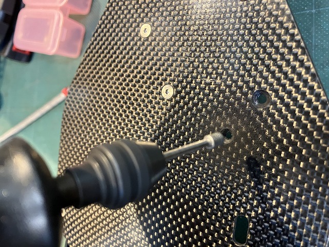 ○ちょっとシャーシ加工 サーボ移設のため、シャーシに穴を開ける。 皿加工のツールがミニ4駆用の2mm用しかなくて、ちょっとやりにくい。 ちょっと曲がったけど、まあしゃーなし。 |