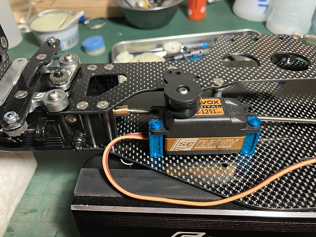 ○サーボ取り付け Xで見かけた搭載位置に移動。 サーボマウントはイーグル製のショートタイプ。 片側はネジが切られてないので、タップで切りました。 あと、サーボのコードが引っかかるので少し側面を削っている。 ←ホーンがこの位置だとボディと干渉することが判明したので逆にしました。もうちょい後ろでも良かったかも。 |