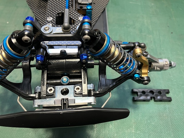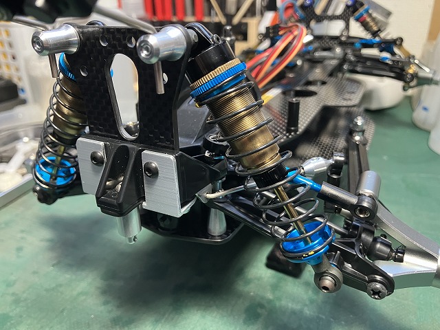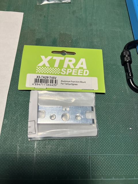 ○追加オプション アリエクからお取り寄せしたXTRA SPEED製のアルミフロントサスアームマウント。 純正の2ピース構造のプラスチック製は耐久性に難がありそうだったので交換。 |