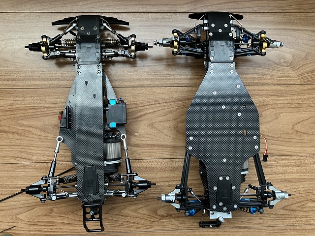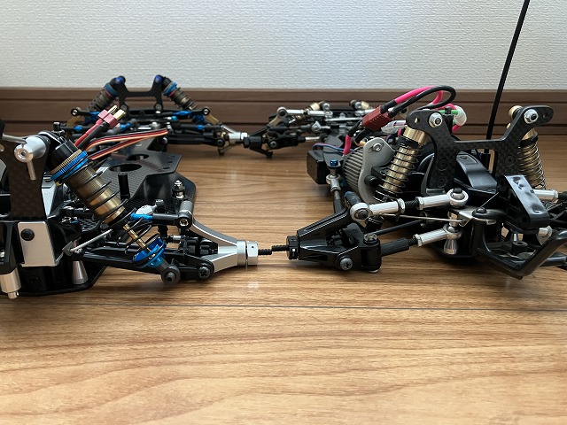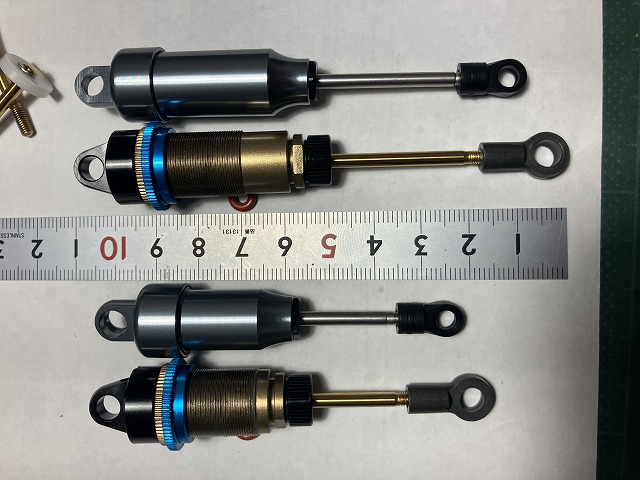 ○ビッグボアARダンパーと標準ハイキャパシティダンパー比較 仮組みして長さの比較。 ビッグボアの方がフロントで3mm、リヤで5mmくらい全長が長いようだ。 |