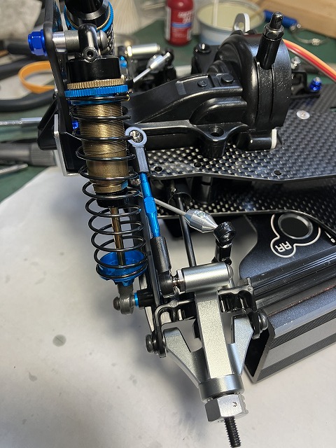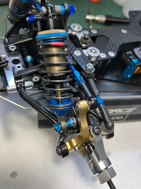 ○ビッグボアARダンパー車体への取り付け 基本的にビッグボア付属の部品を使って取り付けて行くが、径が大きい分、いろいろ干渉するので微調整が必要。 フロントはナックルにスプリングリテーナーが接触するので、下側の取り付け部分に 「長さ22mmビス - フランジナット - 2mmスペーサー」 という感じにしてある。 リヤはスプリングとアッパーアームが接触するので、下側の取り付け部分に1mmのスペーサーを入れている。 バネはフロント赤(ソフト)、リヤ黄色(ミディアム) |