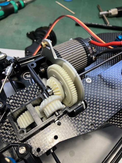 ○モーターとスパーギヤ やっとモーターの取り付け。スパーギヤ悩んだが「センターボールデフ」にしてみた。(アバンテから部品のもぎ取り) トルクスプリッターだと挙動がクイックに過ぎる予感がするし、直結だと曲がらない予感がしたので。 ピニオンギヤはとりあえず20T |