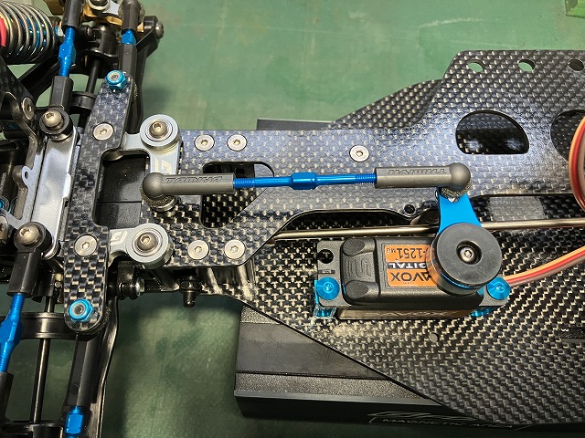 ○ステアリング周り(失敗) サーボの取り付け位置を変更のため、リンケージ用のターンバックルお取り寄せ。OP-1845 3x50mmアルミターンバックルシャフト。 強化アジャスターを使えば、一応ピロボールまでは届いたがネジ込んでいる長さ3mmくらいしかないので、ちょっとダメな感じ。 アルミのサーボホーンはOP-1799 TT-02ハイトルクサーボセイバーセット(アルミホーン付)を使用。フツーのハイトルクサーボセイバーよりちょっと長い。 アジャスタブルなヤツでも良かったがあっちは結構お高いので。 |