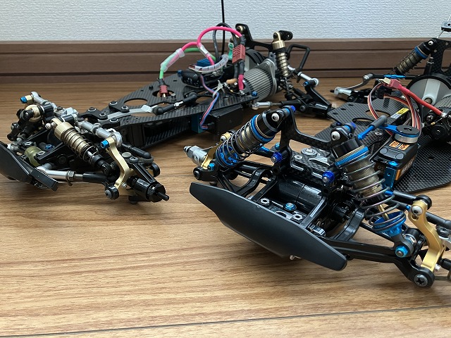 ○イグレス/アバンテ比較(後ろから) 後ろ足は構成がけっこう異なる。流用できる部品はあまりない。 ダンパーステーの位置やら、サスアームの取り付け高さも違う。 ダンパーステーはアバンテ3.5mm厚に対してイグレス2.0mm厚。 イグレスは調整穴もないのでデチューンされてる? |